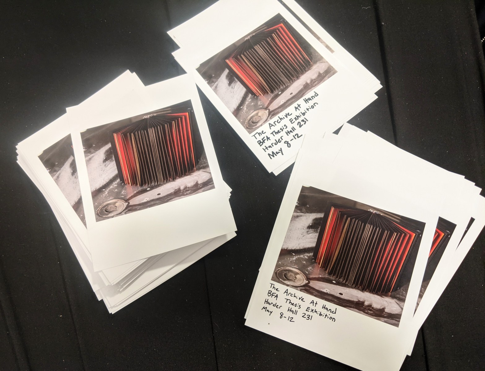 One little bitty polaroid-esque photo with sharpie writing is not a poster and looks cheap. But when you handwrite a million and a half of them, and hang them up in clusters of 6+ wherever you would usually hang a poster, well…. Then you’re underscoring the importance of handwork, series, material scavenging, surface, etc. that the entire thesis grappled with.